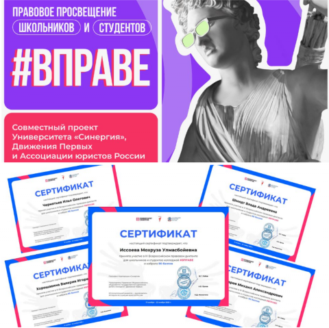 Учащиеся объединения «Юный предприниматель» (5 чел.) впервые приняли участие во Всероссийском проекте правового просвещения школьников и студентов колледжей #ВПРАВЕ. Правовой диктант проходил с 17 по 23 ноября 2025 года и был запущен в 2023 году университетом «Синергия» в сотрудничестве с Ассоциацией юристов России и Российским движением детей и молодёжи #Движение Первых.
