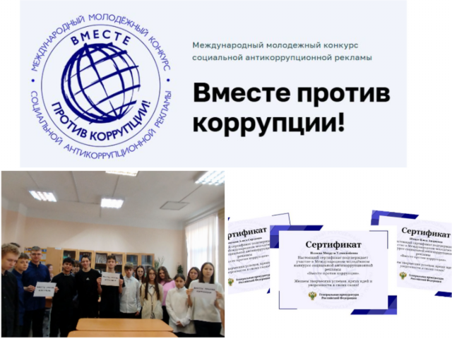 Борьба с коррупцией – это задача не только органов власти, но и каждого человека. Учащиеся из объединения «Юный предприниматель» ( Иссоева Мохруза и Шмидт Влада) приняли участие в Международном молодёжном конкурсе социальной антикоррупционной рекламы «Вместе против коррупции!». Организаторами конкурса являются Генеральная прокуратура РФ и Межгосударственный совет по противодействию коррупции. В этом году в конкурсе приняло участие более 25 государств, поступило 30647 работ. Девушки выбрали для себя номинацию «Лучший рисунок» (приложение - эссе к рисунку). Работы участниц вышли в полуфинал конкурса. Итоги будут подведены 9 декабря в Международный день борьбы с коррупцией. Пожелаем нашим участницам успехов в конкурсе!