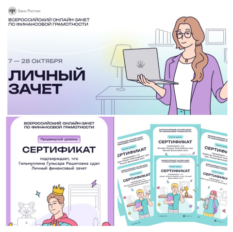 Онлайн-зачёт традиционно разделён на два уровня сложности: базовый (для тех, кто только начинает разбираться в финансах) и продвинутый (для тех, кто готов к сложным вопросам). Педагог Гильмуллина Г.Р. (продвинутый уровень) и ребята (базовый уровень ) успешно сдали зачёт, оценив свои сильные и слабые области знаний о финансах. Все школьники получили именные сертификаты с личными результатами и персональные рекомендации, которые помогут им восполнить пробелы в знаниях о финансах.