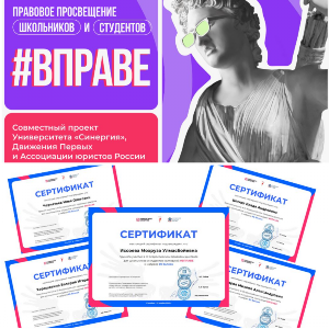 Учащиеся объединения «Юный предприниматель» (5 чел.) впервые приняли участие во Всероссийском проекте правового просвещения школьников и студентов колледжей #ВПРАВЕ. Правовой диктант проходил с 17 по 23 ноября 2025 года и был запущен в 2023 году университетом «Синергия» в сотрудничестве с Ассоциацией юристов России и Российским движением детей и молодёжи #Движение Первых.